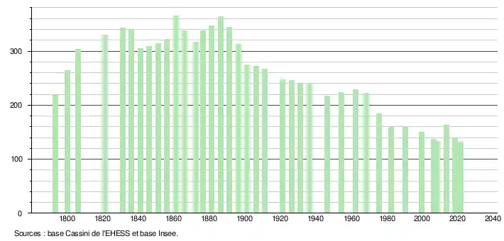 L'évolution du nombre d'habitants est connue à travers les recensements de la population effectués dans la commune depuis 1793. Pour les communes de moins de 10 000 habitants, une enquête de recensement portant sur toute la population est réalisée tous les cinq ans, les populations légales des années intermédiaires étant quant à elles estimées par interpolation ou extrapolation[21]. Pour la commune, le premier recensement exhaustif entrant dans le cadre du nouveau dispositif a été réalisé en 2008[22].