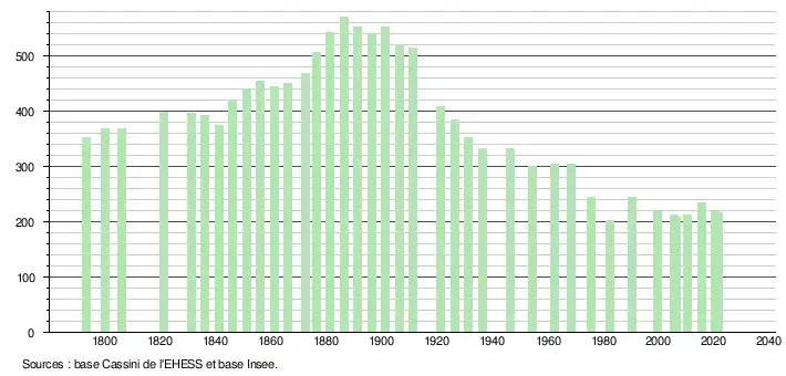 L'évolution du nombre d'habitants est connue à travers les recensements de la population effectués dans la commune depuis 1793. Pour les communes de moins de 10 000 habitants, une enquête de recensement portant sur toute la population est réalisée tous les cinq ans, les populations légales des années intermédiaires étant quant à elles estimées par interpolation ou extrapolation[22]. Pour la commune, le premier recensement exhaustif entrant dans le cadre du nouveau dispositif a été réalisé en 2005[23].