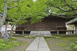 Un peu au-dessus du Taishaku-dō se tient le Hokke-dō, petit édifice qui est de facto le bâtiment principal du temple[3]. Le bâtiment, construit durant l'époque Muromachi, est un bien culturel important du Japon[3] qui contient lui-même trois autres biens culturels importants, un gong (waniguchi), une table à manger laquée (kakeban) et un chandelier (shokudai)[3].