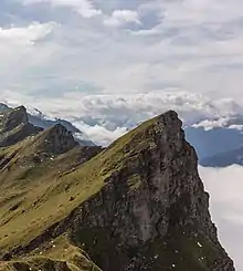 Vue depuis le Gürgaletsch (2 560 m) vers le sommet du Hüenerchöpf à l'est, dans la chaîne de Plessur.