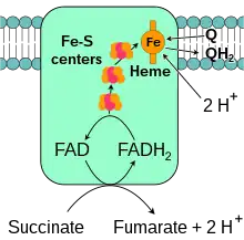 La succinate déshydrogénase (EC ), également appelée complexe II, est le deuxième point d'entrée des électrons dans la chaîne respiratoire[17]. Cette enzyme présente la particularité d'appartenir à la fois au cycle de Krebs et à la chaîne respiratoire. Elle est constituée de quatre sous-unités et de plusieurs cofacteurs : FAD, centres fer-soufre, et un groupe héminique qui ne participe pas au transfert des électrons à la coenzyme Q10 mais jouerait un rôle important en limitant la production de dérivés réactifs de l'oxygène[18],[19]. Elle catalyse l'oxydation du succinate en fumarate et la réduction de la coenzyme Q10. Cette réaction libère moins d'énergie que l'oxydation du NADH, ce qui fait que le complexe II ne contribue pas à la génération du gradient de concentration de protons.