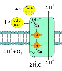 Cette enzyme catalyse le transfert d'électrons à une molécule d'oxygène O2 tout en pompant des protons à travers la membrane mitochondriale interne[35]. Deux molécules d'eau H2O sont formées par molécule d'oxygène réduite, tandis que quatre protons sont expulsés vers l'espace intermembranaire mitochondrial, ce qui contribue à la génération du gradient de concentration de protons à travers la membrane interne :