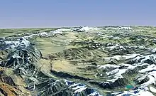 Image de synthèse représentant le chaînon Kashgar à gauche et une partie du chaînon Sarikol à droite.