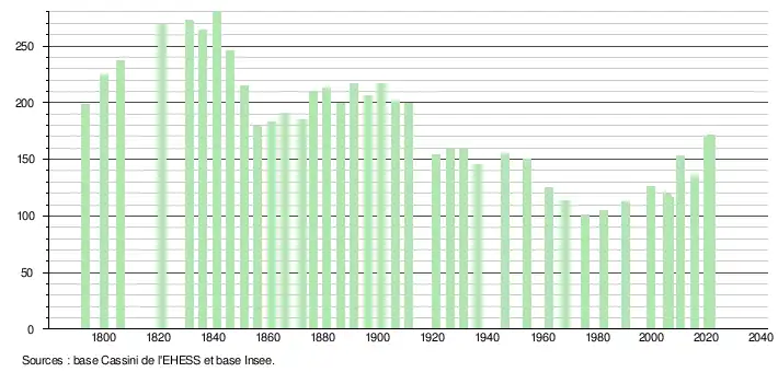 L'évolution du nombre d'habitants est connue à travers les recensements de la population effectués dans la commune depuis 1793. Pour les communes de moins de 10 000 habitants, une enquête de recensement portant sur toute la population est réalisée tous les cinq ans, les populations légales des années intermédiaires étant quant à elles estimées par interpolation ou extrapolation[22]. Pour la commune, le premier recensement exhaustif entrant dans le cadre du nouveau dispositif a été réalisé en 2005[23].