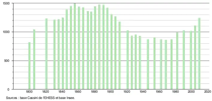 L'évolution du nombre d'habitants est connue à travers les recensements de la population effectués dans la commune depuis 1800. À partir du , les populations légales des communes sont publiées annuellement dans le cadre d'un recensement qui repose désormais sur une collecte d'information annuelle, concernant successivement tous les territoires communaux au cours d'une période de cinq ans. Pour les communes de moins de 10 000 habitants, une enquête de recensement portant sur toute la population est réalisée tous les cinq ans, les populations légales des années intermédiaires étant quant à elles estimées par interpolation ou extrapolation[7]. Pour la commune, le premier recensement exhaustif entrant dans le cadre du nouveau dispositif a été réalisé en 2004[8],[Note 2].