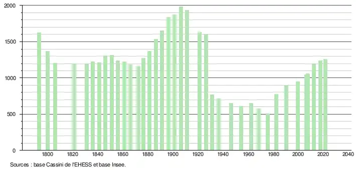 L'évolution du nombre d'habitants est connue à travers les recensements de la population effectués dans la commune depuis 1793. Pour les communes de moins de 10 000 habitants, une enquête de recensement portant sur toute la population est réalisée tous les cinq ans, les populations légales des années intermédiaires étant quant à elles estimées par interpolation ou extrapolation[30]. Pour la commune, le premier recensement exhaustif entrant dans le cadre du nouveau dispositif a été réalisé en 2007[31].