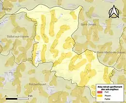 Le retrait-gonflement des sols argileux est susceptible d'engendrer des dommages importants aux bâtiments en cas d’alternance de périodes de sécheresse et de pluie[20]. 38,7 % de la superficie communale est en aléa moyen ou fort (27 % au niveau départemental et 48,5 % au niveau national métropolitain)[Carte 2]. Depuis le , en application de la loi ÉLAN, différentes contraintes s'imposent aux vendeurs, maîtres d'ouvrages ou constructeurs de biens situés dans une zone classée en aléa moyen ou fort[Note 3],[21].