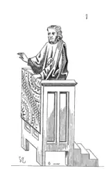 Dans les vieilles églises, la chaire est plutôt un pupitre disposé sur le côté droit du chœur pour la lecture de l'épître et sur le côté gauche pour celle de l'Évangile. À partir du XIIe siècle, un pupitre surélevé ou une estrade mobile sert à la prédication. L'estrade est en bois, fermée sur trois côtés et recouverte sur le devant d'un tapis.
