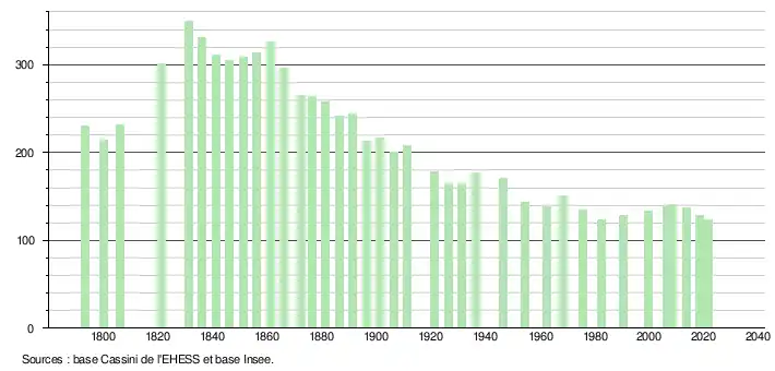 L'évolution du nombre d'habitants est connue à travers les recensements de la population effectués dans la commune depuis 1793. Pour les communes de moins de 10 000 habitants, une enquête de recensement portant sur toute la population est réalisée tous les cinq ans, les populations légales des années intermédiaires étant quant à elles estimées par interpolation ou extrapolation[20]. Pour la commune, le premier recensement exhaustif entrant dans le cadre du nouveau dispositif a été réalisé en 2008[21].