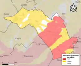 La commune est vulnérable au risque de mouvements de terrains constitué principalement du retrait-gonflement des sols argileux[17]. Cet aléa est susceptible d'engendrer des dommages importants aux bâtiments en cas d’alternance de périodes de sécheresse et de pluie. 92,7 % de la superficie communale est en aléa moyen ou fort (90 % au niveau départemental et 48,5 % au niveau national). Sur les 255 bâtiments dénombrés sur la commune en 2019, 252 sont en aléa moyen ou fort, soit 99 %, à comparer aux 83 % au niveau départemental et 54 % au niveau national. Une cartographie de l'exposition du territoire national au retrait gonflement des sols argileux est disponible sur le site du BRGM[18],[Carte 2].
