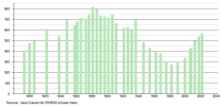L'évolution du nombre d'habitants est connue à travers les recensements de la population effectués dans la commune depuis 1793. Pour les communes de moins de 10 000 habitants, une enquête de recensement portant sur toute la population est réalisée tous les cinq ans, les populations légales des années intermédiaires étant quant à elles estimées par interpolation ou extrapolation[13]. Pour la commune, le premier recensement exhaustif entrant dans le cadre du nouveau dispositif a été réalisé en 2007[14].
