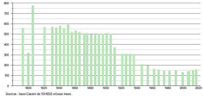 L'évolution du nombre d'habitants est connue à travers les recensements de la population effectués dans la commune depuis 1793. Pour les communes de moins de 10 000 habitants, une enquête de recensement portant sur toute la population est réalisée tous les cinq ans, les populations légales des années intermédiaires étant quant à elles estimées par interpolation ou extrapolation[3]. Pour la commune, le premier recensement exhaustif entrant dans le cadre du nouveau dispositif a été réalisé en 2007[4].