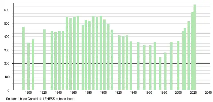 L'évolution du nombre d'habitants est connue à travers les recensements de la population effectués dans la commune depuis 1793. Pour les communes de moins de 10 000 habitants, une enquête de recensement portant sur toute la population est réalisée tous les cinq ans, les populations légales des années intermédiaires étant quant à elles estimées par interpolation ou extrapolation[19]. Pour la commune, le premier recensement exhaustif entrant dans le cadre du nouveau dispositif a été réalisé en 2008[20].