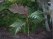 Le palmier Chambeyronia macrocarpa a un aspect très singulier et facilement identifiable du fait de la couleur rouge vif de ses feuilles juvéniles. Son tronc de 15 à 25 cm de diamètre peut grandir jusqu'à 20 m et émerger de la canopée. Les fruits mesurent environ 4 cm et rougissent à maturité.