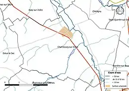 Le centre urbain de Chambourg-sur-Indre est regroupé autour du pôle constitué par l'église et la mairie, à partir du croisement entre la D 94 (nord-est sud-est) et la D 17 (nord-ouest sud-est). Ce site, surplombant de 10 mètres le flanc gauche de la vallée de l'Indre qui coule au nord-est, est à l'abri de risques d'inondations[31]. L'habitat s'est étendu au depuis 1980 sous forme de lotissements bordant de nouvelles voies, à l'ouest et à l'est du bourg, ces dernières constructions étant établies plus directement dans le fond de la vallée de l'Indre. À l'ouest du bourg se trouve également la zone d'activités de la commune. Une fois franchie la série des trois ponts permettant à la D 94 de traverser la vallée de l'Indre en direction du nord-est et de Chédigny, on trouve l'Isle Thimée, important hameau qui a bénéficié lui aussi de nouvelles constructions, comme le centre-bourg dont il constitue en quelque sorte le pendant sur la rive droite de l'Indre[Site 2].