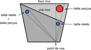 - la pièce apparaît cubique si elle est observée à partir d'un point spécial (la vision doit s'effectuer avec un seul œil, afin d'éliminer l'effet stéréoscopique, en fait elle est trapézoïdale) ;