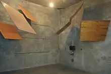 L'isolation vibratoire de l'infrastructure et des murs épais en béton assurent l'isolation aux bruits aériens et solidiens. Les parois y compris le plancher et le plafond ne sont pas parallèles pour éviter la formation d'ondes stationnaires ; des pièces acoustiques, telles que des panneaux courbes ou des sphères en plastique ou en bois, diffusent le son dans les angles. Des diffuseurs rotatifs peuvent être utilisés. Aux hautes fréquences, l'absorption de l'air prédomine sur celle de la structure[1].