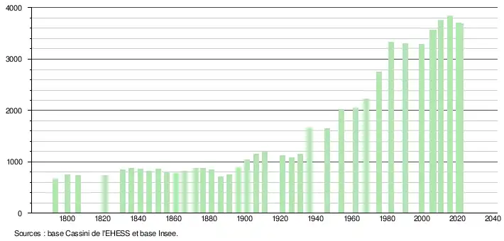 L'évolution du nombre d'habitants est connue à travers les recensements de la population effectués dans la commune depuis 1793. Pour les communes de moins de 10 000 habitants, une enquête de recensement portant sur toute la population est réalisée tous les cinq ans, les populations légales des années intermédiaires étant quant à elles estimées par interpolation ou extrapolation[27]. Pour la commune, le premier recensement exhaustif entrant dans le cadre du nouveau dispositif a été réalisé en 2005[28].