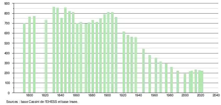 | L'évolution du nombre d'habitants est connue à travers les recensements de la population effectués dans la commune depuis 1793. Pour les communes de moins de 10 000 habitants, une enquête de recensement portant sur toute la population est réalisée tous les cinq ans, les populations légales des années intermédiaires étant quant à elles estimées par interpolation ou extrapolation[25]. Pour la commune, le premier recensement exhaustif entrant dans le cadre du nouveau dispositif a été réalisé en 2008[26]. En 2021, la commune comptait 223 habitants[Note 4], en diminution de 8,61 % par rapport à 2015 (Corrèze : −0,86 %, France hors Mayotte : +1,84 %). |