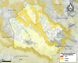 Le retrait-gonflement des sols argileux est susceptible d'engendrer des dommages importants aux bâtiments en cas d’alternance de périodes de sécheresse et de pluie. 31,2 % de la superficie communale est en aléa moyen ou fort (26,8 % au niveau départemental et 48,5 % au niveau national). Sur les 150 bâtiments dénombrés sur la commune en 2019, quatre sont en aléa moyen ou fort, soit 3 %, à comparer aux 36 % au niveau départemental et 54 % au niveau national. Une cartographie de l'exposition du territoire national au retrait gonflement des sols argileux est disponible sur le site du BRGM[16],[Carte 2].