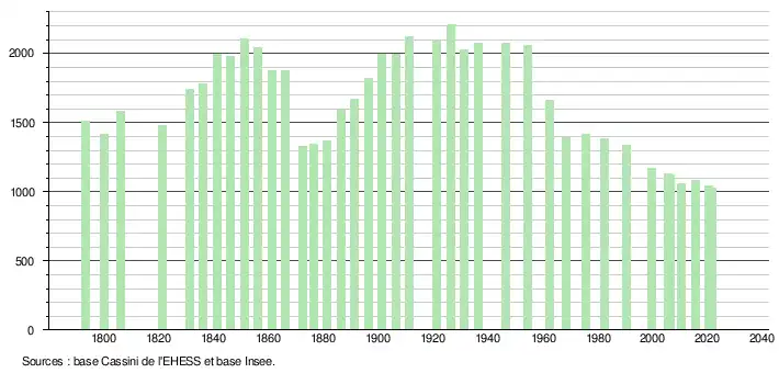 L'évolution du nombre d'habitants est connue à travers les recensements de la population effectués dans la commune depuis 1793. Pour les communes de moins de 10 000 habitants, une enquête de recensement portant sur toute la population est réalisée tous les cinq ans, les populations légales des années intermédiaires étant quant à elles estimées par interpolation ou extrapolation[18]. Pour la commune, le premier recensement exhaustif entrant dans le cadre du nouveau dispositif a été réalisé en 2005[19].