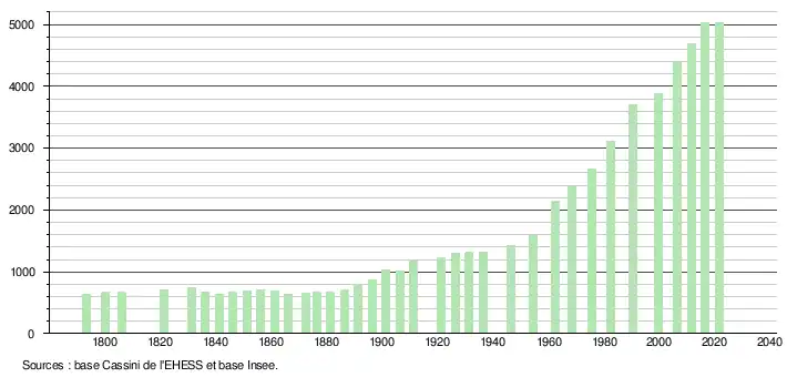 L'évolution du nombre d'habitants est connue à travers les recensements de la population effectués dans la commune depuis 1793. Pour les communes de moins de 10 000 habitants, une enquête de recensement portant sur toute la population est réalisée tous les cinq ans, les populations légales des années intermédiaires étant quant à elles estimées par interpolation ou extrapolation[32]. Pour la commune, le premier recensement exhaustif entrant dans le cadre du nouveau dispositif a été réalisé en 2006[33].