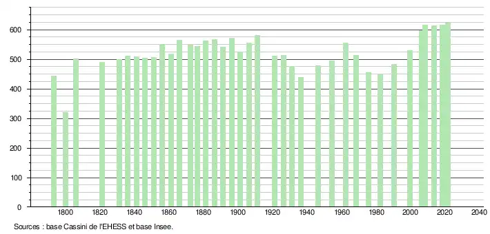 L'évolution du nombre d'habitants est connue à travers les recensements de la population effectués dans la commune depuis 1793. Pour les communes de moins de 10 000 habitants, une enquête de recensement portant sur toute la population est réalisée tous les cinq ans, les populations légales des années intermédiaires étant quant à elles estimées par interpolation ou extrapolation[10]. Pour la commune, le premier recensement exhaustif entrant dans le cadre du nouveau dispositif a été réalisé en 2008[11].