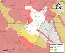 Le retrait-gonflement des sols argileux est susceptible d'engendrer des dommages importants aux bâtiments en cas d’alternance de périodes de sécheresse et de pluie. 53,1 % de la superficie communale est en aléa moyen ou fort (54,2 % au niveau départemental et 48,5 % au niveau national). Sur les 359 bâtiments dénombrés sur la commune en 2019, 108 sont en aléa moyen ou fort, soit 30 %, à comparer aux 57 % au niveau départemental et 54 % au niveau national. Une cartographie de l'exposition du territoire national au retrait gonflement des sols argileux est disponible sur le site du BRGM[17],[Carte 2].