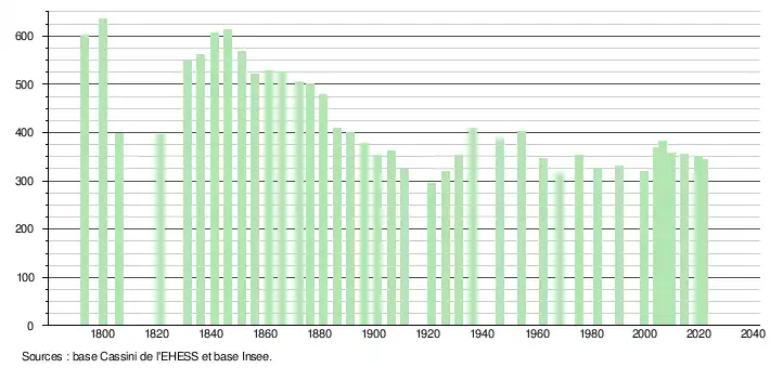 L'évolution du nombre d'habitants est connue à travers les recensements de la population effectués dans la commune depuis 1793. Pour les communes de moins de 10 000 habitants, une enquête de recensement portant sur toute la population est réalisée tous les cinq ans, les populations légales des années intermédiaires étant quant à elles estimées par interpolation ou extrapolation[44]. Pour la commune, le premier recensement exhaustif entrant dans le cadre du nouveau dispositif a été réalisé en 2004[45].