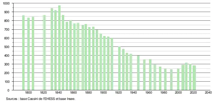 L'évolution du nombre d'habitants est connue à travers les recensements de la population effectués dans la commune depuis 1793. Pour les communes de moins de 10 000 habitants, une enquête de recensement portant sur toute la population est réalisée tous les cinq ans, les populations légales des années intermédiaires étant quant à elles estimées par interpolation ou extrapolation[15]. Pour la commune, le premier recensement exhaustif entrant dans le cadre du nouveau dispositif a été réalisé en 2005[16].