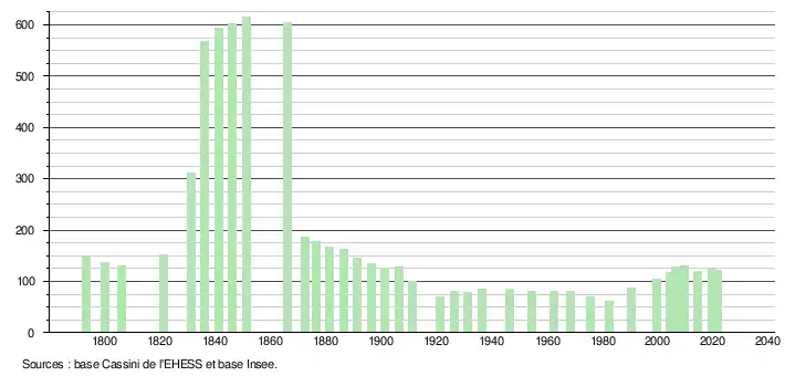 L'évolution du nombre d'habitants est connue à travers les recensements de la population effectués dans la commune depuis 1793. Pour les communes de moins de 10 000 habitants, une enquête de recensement portant sur toute la population est réalisée tous les cinq ans, les populations légales des années intermédiaires étant quant à elles estimées par interpolation ou extrapolation[16]. Pour la commune, le premier recensement exhaustif entrant dans le cadre du nouveau dispositif a été réalisé en 2004[17].