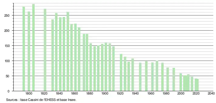 L'évolution du nombre d'habitants est connue à travers les recensements de la population effectués dans la commune depuis 1793. Pour les communes de moins de 10 000 habitants, une enquête de recensement portant sur toute la population est réalisée tous les cinq ans, les populations légales des années intermédiaires étant quant à elles estimées par interpolation ou extrapolation[14]. Pour la commune, le premier recensement exhaustif entrant dans le cadre du nouveau dispositif a été réalisé en 2004[15].