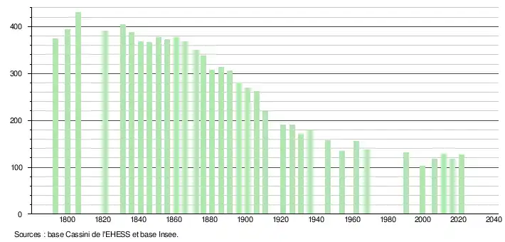 L'évolution du nombre d'habitants est connue à travers les recensements de la population effectués dans la commune depuis 1793. Pour les communes de moins de 10 000 habitants, une enquête de recensement portant sur toute la population est réalisée tous les cinq ans, les populations légales des années intermédiaires étant quant à elles estimées par interpolation ou extrapolation[14]. Pour la commune, le premier recensement exhaustif entrant dans le cadre du nouveau dispositif a été réalisé en 2006[15].
