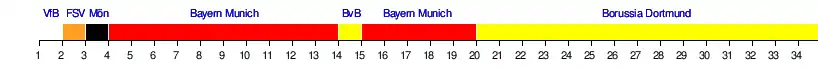 | Borussia Dortmund | 2 | 7 | 6 | 6 | 11 | 11 | 8 | 6 | 3 | 2 | 3 | 2 | 2 | 1 | 2 | 2 | 2 | 2 | 2 | 1 | 1 | 1 | 1 | 1 | 1 | 1 | 1 | 1 | 1 | 1 | 1 | 1 | 1 | 1 | 16 | 0 |