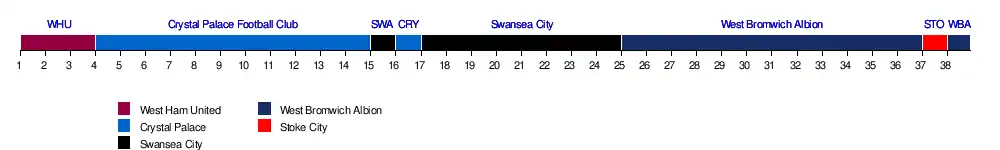 | Crystal Palace | 19 | 18 | 19 | 20 | 20 | 20 | 20 | 20 | 20 | 20 | 20 | 20 | 20 | 20 | 19 | 20 | 18 | 14 | 16 | 16 | 17 | 14 | 12 | 13 | 13 | 14 | 15 | 17 | 18 | 18 | 16 | 17 | 17 | 16 | 14 | 11 | 11 | 11 | 19 | |