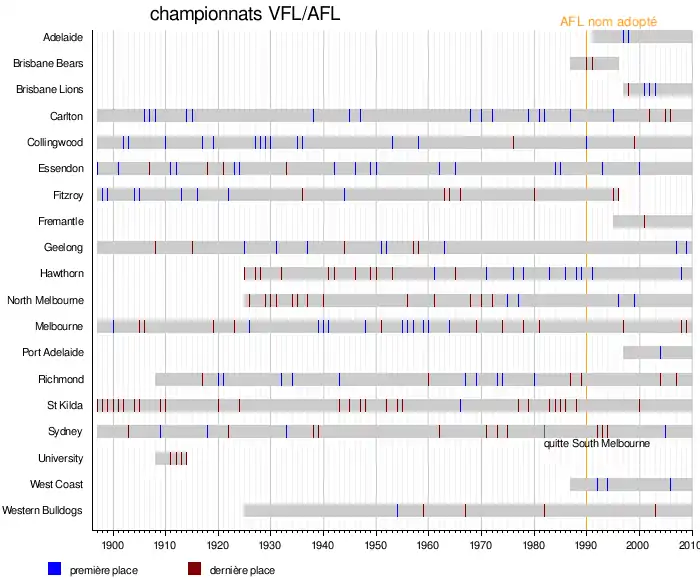 Le terme AFL est adopté en 1990 afin de mieux rendre compte de la dimension nationale de la compétition[6]. La Victorian Football Association prend le nom de la Victorian Football League en 1996. L'AFL abandonne le contrôle des ligues inférieures à la fin de l'année 1991, les clubs continuent de déployer les équipes réserves dans la Victorian Football League.