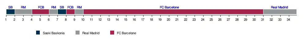 | FC Barcelone | 2 | 2 | 2 | 1 | 1 | 2 | 3 | 1 | 2 | 1 | 1 | 1 | 1 | 1 | 1 | 1 | 1 | 1 | 1 | 1 | 1 | 1 | 1 | 1 | 1 | 1 | 1 | 1 | 1 | 1 | 3 | 3 | 3 | 2 | 34 | |