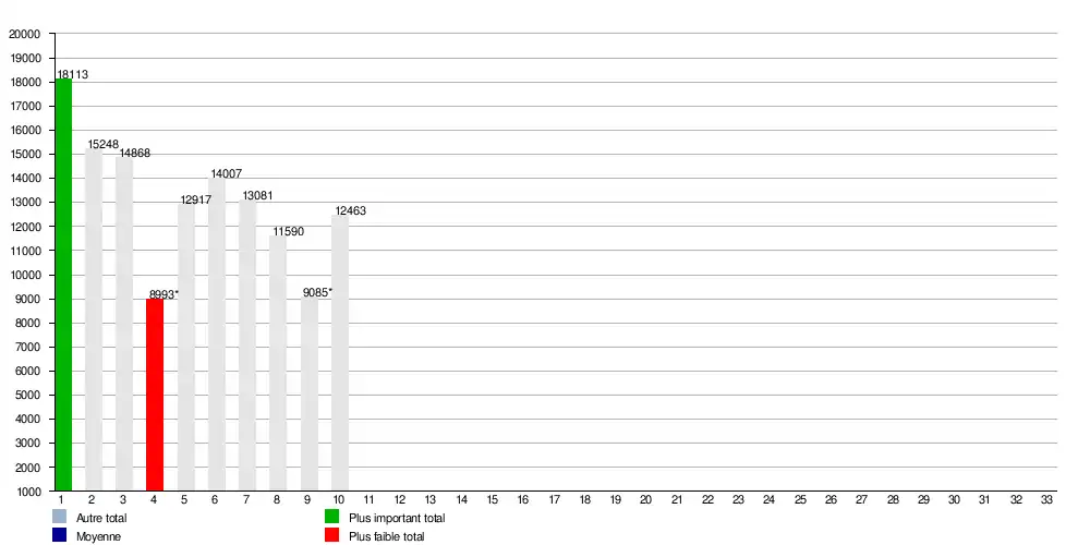 Ce graphique le nombre de spectateurs lors de chaque journée. Il prend en compte la totalité des matchs Premier et First Divisions ajoutés.