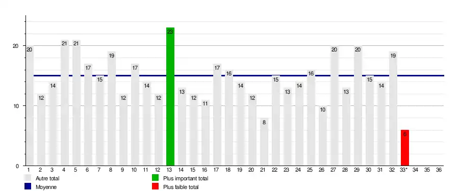 | Journée → | 1 | 2 | 3 | 4 | 5 | 6 | 7 | 8 | 9 | 10 | 11 | 12 | 13 | 14 | 15 | 16 | 17 | 18 | 19 | 20 | 21 | 22 | 23 | 24 | 25 | 26 | 27 | 28 | 29 | 30 | 31 | 32 | 33 | 34 | 35 | 36 | Journées en tête | Journées relégable |