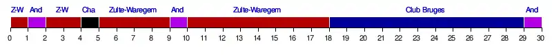 | Zulte-Waregem | 0-0 | 3-2 | 1-1 | 1-0 | 1-1 | 2-1 | 1-1 | 1-0 | 2-0 | 0-0 | 1-0 | 1-1 | 4-1 | 2-2 | 3-0 | |