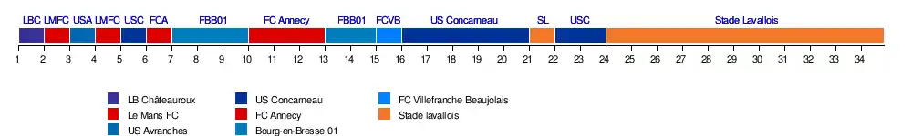 | Châteauroux | 1 | 9 | 3 | 7 | 7 | 6 | 6 | 8 | 5 | 9 | 8 | 8 | 6 | 5 | 5 | 6 | 6 | 6 | 7 | 6 | 6 | 6 | 7 | 6 | 7 | 7 | 7 | 6 | 6 | 5 | 5 | 6 | 6 | 5 | 2 | |