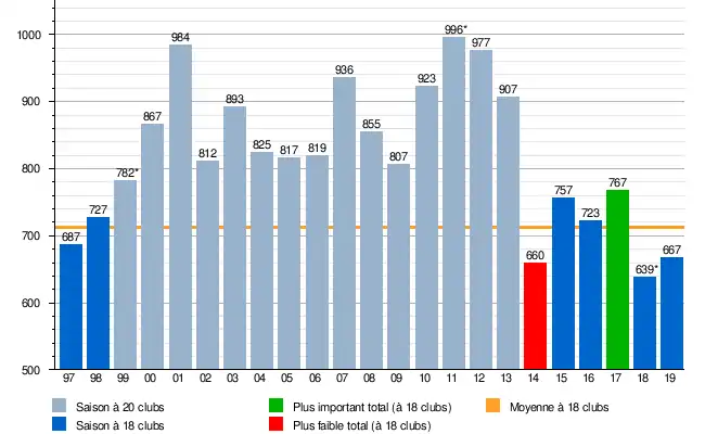 La moyenne se base uniquement sur les saisons à 18 clubs (système actuel)