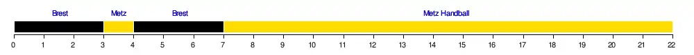 | Besançon | 29-27 | 29-31 | 33-32 | 31-30 | 28-26 | 34-34 | 26-27 | 22-23 | 20-0 | 38-20 | 34-28 | |