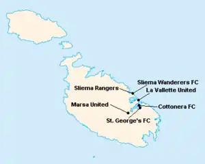L'île de Malte étant relativement petite, les clubs évoluent tous au stade National Ta'Qali (17 400 places). Certains cependant ont leur propre enceinte qu'ils peuvent éventuellement utiliser.