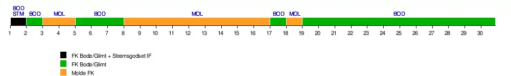 | Bodø/Glimt | 1 | 1 | 2 | 2 | 1 | 1 | 1 | 2 | 3 | 4 | 6 | 3 | 4 | 2 | 2 | 2 | 1 | 2 | 1 | 1 | 1 | 1 | 1 | 1 | 1 | 1 | 1 | 1 | 1 | 1 | 18 | 0 |