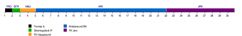 | Tromsø | 16 | 11 | 11 | 13 | 14 | 14 | 12 | 13 | 13 | 13 | 13 | 12 | 12 | 12 | 13 | 11 | 9 | 8 | 8 | 8 | 8 | 7 | 9 | 9 | 7 | 6 | 6 | 7 | 7 | 7 | 0 | 1 |