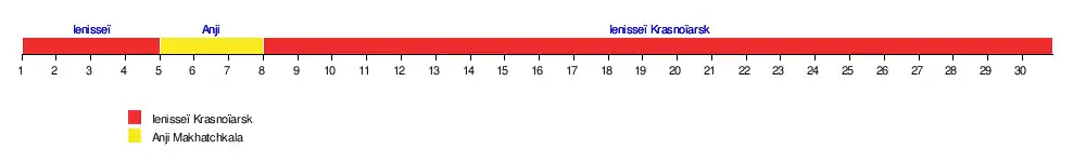 | Orenbourg | 15 | 6 | 3 | 3 | 4 | 5 | 9 | 7 | 9 | 8 | 8 | 8 | 7 | 10 | 8 | 7 | 10 | 12 | 12 | 10 | 10 | 10 | 7 | 6 | 7 | 7 | 9 | 9 | 8 | 7 | 1 | ||