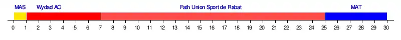 | Résultats (▼dom., ►ext.) | MAS | WAF | FAR | FUS | WAC | RCA | KAC | OCK | OCS | DHJ | MAT | JSM | HUSA | CRA | CODM | IZK |