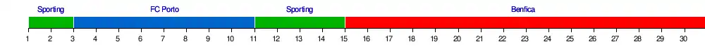 | Benfica | 9 | 8 | 7 | 5 | 4 | 5 | 3 | 3 | 3 | 3 | 2 | 3 | 3 | 3 | 1 | 1 | 1 | 1 | 1 | 1 | 1 | 1 | 1 | 1 | 1 | 1 | 1 | 1 | 1 | 1 |