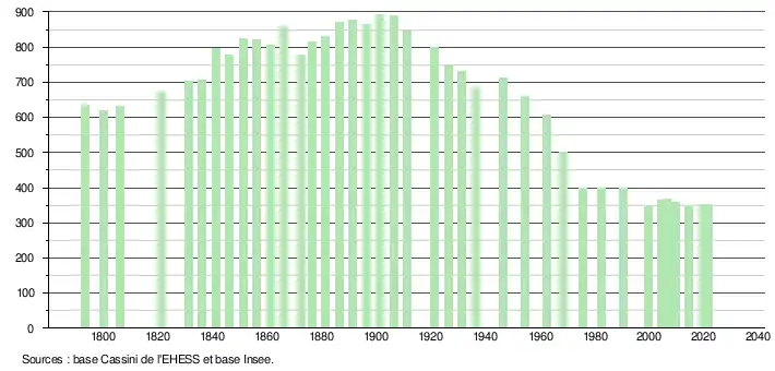 L'évolution du nombre d'habitants est connue à travers les recensements de la population effectués dans la commune depuis 1793. Pour les communes de moins de 10 000 habitants, une enquête de recensement portant sur toute la population est réalisée tous les cinq ans, les populations légales des années intermédiaires étant quant à elles estimées par interpolation ou extrapolation[24]. Pour la commune, le premier recensement exhaustif entrant dans le cadre du nouveau dispositif a été réalisé en 2004[25].